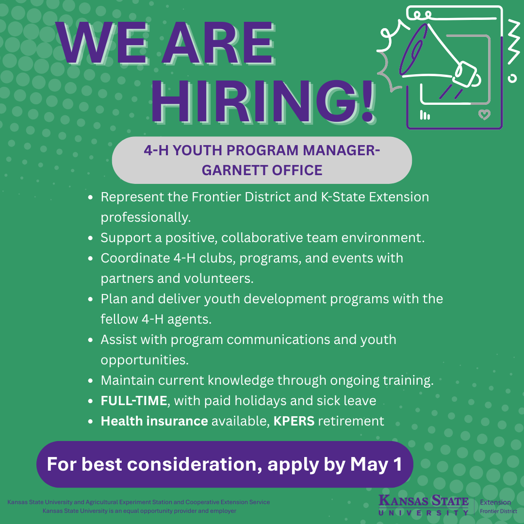 To apply, submit a cover letter, resume, and application. Screening will begin immediately and continue until the position is filled. Applications must be submitted by email to Rebecca McFarland, District Director, at rmcfarla@ksu.edu. Email subject: “4-H Program Manager Application," by MAY 1.